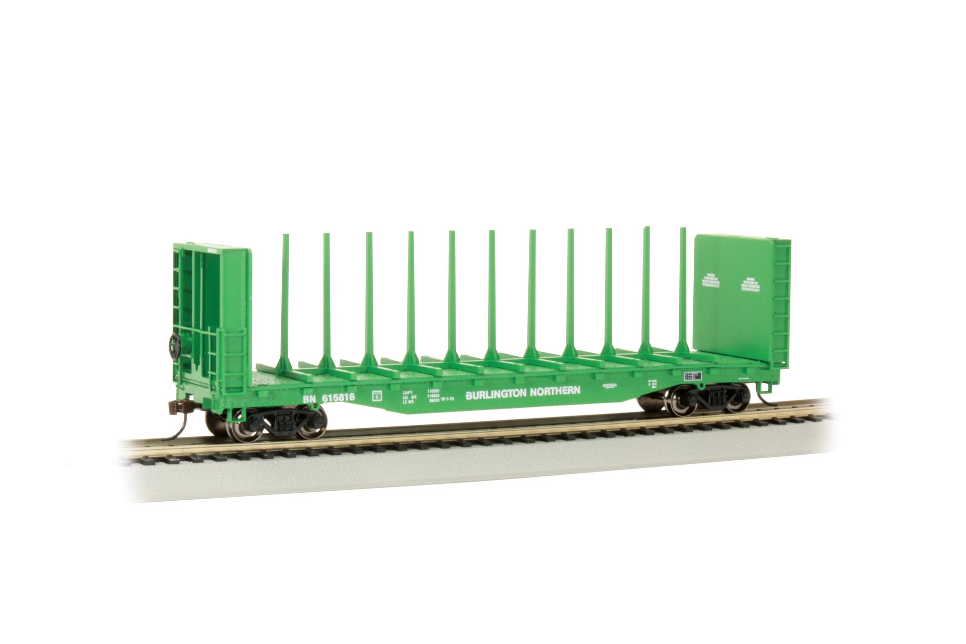 Center-beam cars are specialty cars designed for carrying building supplies such as cut wood, lumber, or drywall sheets. They are essentially bulkhead flatcars that have been reinforced with additional central supports for the side-loading of bulk materials. Performs best on 22' radius curves or greater.