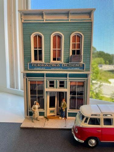 This is a terrific looking O scale model store. Its laser cut pieces are complemented by the ingenious self stick qualities of its window & door trims. That sure speeds construction. Almost all of the parts fit together perfectly. That is refreshing since many of its individual parts are composed of very different materials. My only minor criticism of this building is its architecture. The main floor windows are just too large to portray a rustic bank convincingly. Jesse James & his gang would be real happy to see those extra large windows set in front of their target bank. Those downstairs windows measure 9 feet tall by 4 feet wide. Jesse's gang could run their horses through them. It sort of defeats the idea of having a secure Victorian bank building. I've reconstructed my version as a Jewelry/Antiques & Clothing store, so it will be more fitting in a mid 50's railroad town. Construction was made simple & easy with such well fitting pieces, and in the end it makes up a rather charming little building.