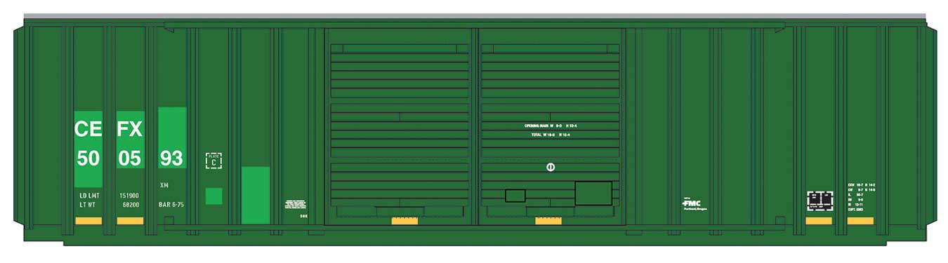 PREORDER Intermountain HO 48320 FMC 5283 Cubic Foot Double-Door Boxcar, CEFX (Patched, green)