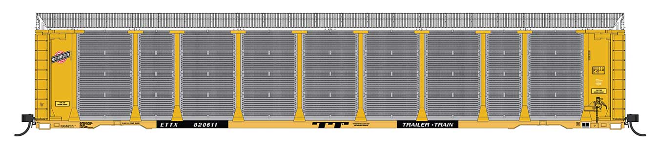 PREORDER Intermountain N 182107-03 Tri-Level Enclosed Auto Rack, Chicago & North Western ETTX #701402 (yellow, black, red, silver)