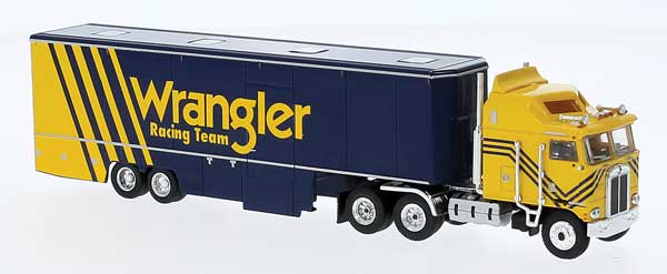 Kenworth K100 Aerodyne Sleeper-Cab Semi Tractor w/Racing Trailer - Assembled -- Dale Earnhardt Team (Wrangler, blue, yellow)