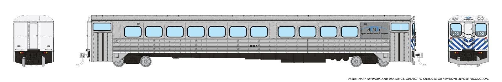 PREORDER Rapido HO 226104 Hawker Siddeley Commuter Cab Coach, AMT Montreal #102 (stainless, blue, white)