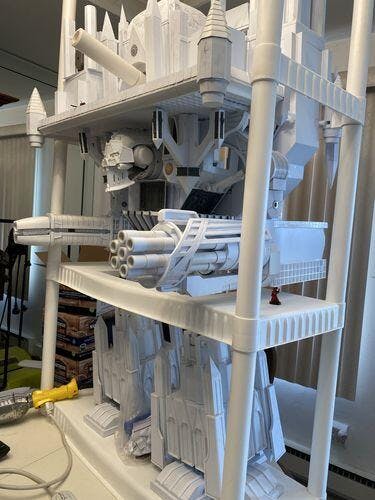 I started building this about 5 years ago. It's an Emperor Titan from the Warhammer 40K Universe My son got me interested in scratch building these gigantic machines when he was in his early teens and was saving up to buy a much smaller Titan. Since then I've built a dozen or so of these complex models. This is my latest project.