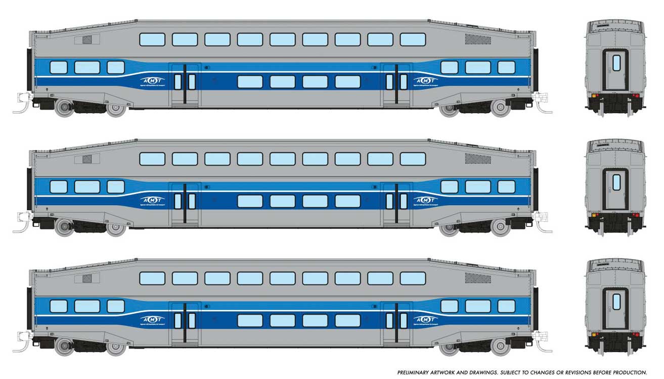 PREORDER Rapido 546006 N Bilevel Commuter Coach 3-Pack - Ready to Run -- AMT Montreal #2020, 2028, 2033 (blue, gray)