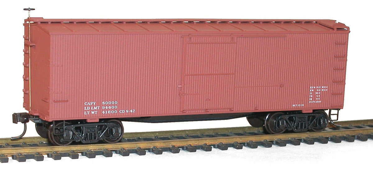 This easy-to-assemble Accurail HO Scale 36' Double-Sheathed Wood Boxcar w/Wood Ends, Fishbelly Underframe kit features a one-piece detailed injection-molded body with a steel roof and end details and a fishbelly underframe. Most details such as grab irons are molded in place for durability during operation. Other features include realistic decoration with end reporting marks (on decorated models), underbody details, trucks with Delrin wheelsets, nonmagnetic axles and AccuMate(R) magnetic knuckle couplers. This wood boxcar kit is great for modelers of all skill levels and includes complete instructions.