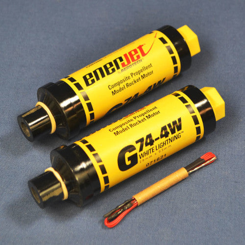 Enerjet G74-4W mid-power motors are single-use composite propellant model rocket motors. These high performance, composite propellant model rocket motors use the same family of solid propellant as NASA’s Space Shuttle Boosters, military missiles, sounding rockets, and NASA’s future SLS moon rocket. They utilize a patent pending high-strength polymer case and bulkhead, polymer nozzle and RCSs exclusive White Lightning™ aerospace grade composite propellant formulation, which produces a gorgeous bright white flame with lots of smoke and a throaty roar.