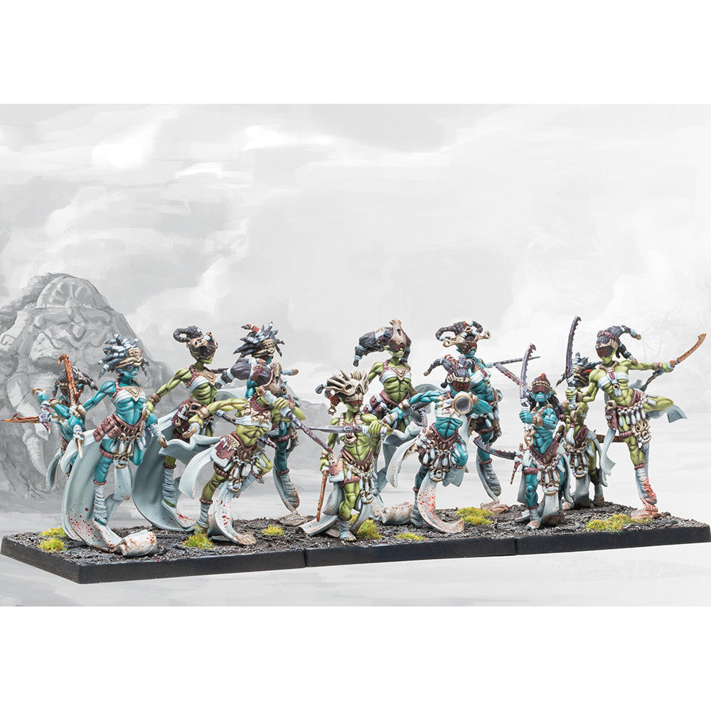 There are few warriors on any battlefield as terrifying as the chosen priestesses of Death. The deep meditative state they are capable of achieving allows them to elevate their hearing to truly superhuman levels, allowing them to "see" through sound giving them a preternatural advantage on the battlefield. They flow onto the battlefield with a deadly grace, their blindfolded forms weaving and covering one another in perfect synchronicity, the entire regiment fighting as a single organism. Entrusted by the tribes as midwives and healers, their medical training makes them deadly foes on the battlefield, their every blow precisely placed to cause the greatest harm possible, severing tendons, rupturing arteries and locking joints with pinpoint precision as they dance away from their foes' clumsy blows.