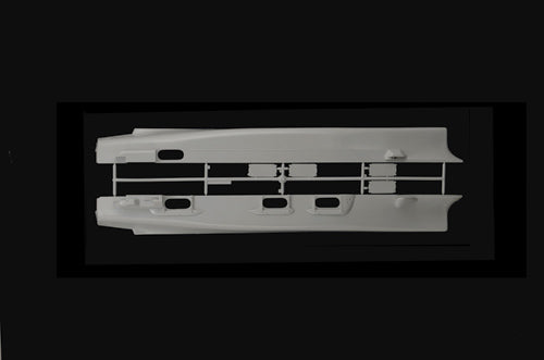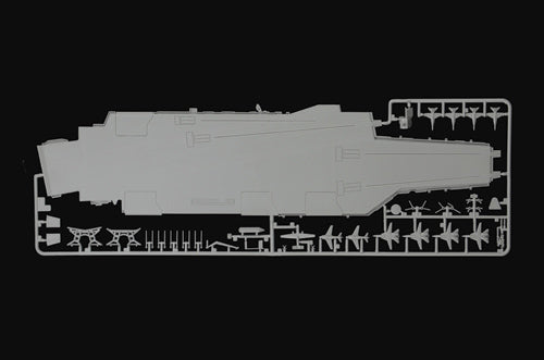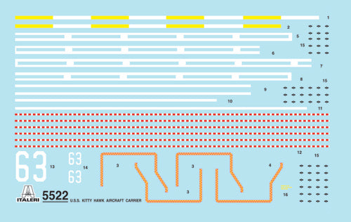 The aircraft carrier U.S.S. Kitty Hawk CV 63 entered service in April 1961 after a prolonged project based upon the Forrestal class and is considered a carrier evolution. The distinct change of this new class is the location of two of the four aircraft elevators in front of the tower which serve as improvement to move planes around the flight deck. Radar screens behind the towel make the tower "lsland" more compact. During the last thirty years the Kitty Hawk has been altered considerably. Especially defence armament and electronic equipment up-dates keep the carrier in maximum use.