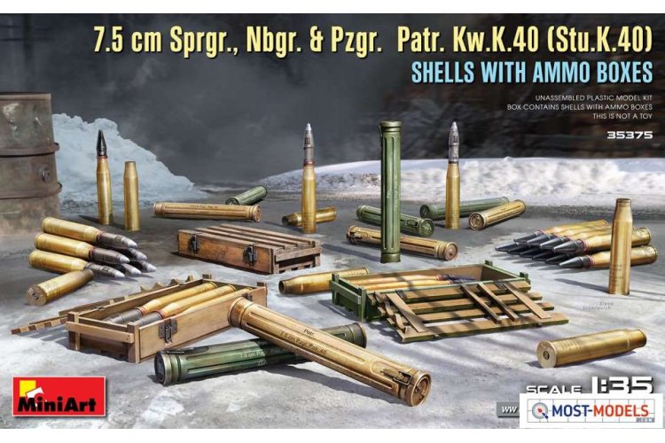 Plastic model kit 1:35 MiniArt 35375 7.5 cm Sprgr., Nbgr. & Pzgr. Patr. Kw.K.40 (Stu.K.40) Shells w/ Ammo Boxes.