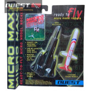 Excellent for backyard launches, this dual rocket pack includes two highly detailed, ready-to-fly Micro Maxx™ rockets, the SR-71 Blackbird and the Tomahawk Cruise Missile. This dual pack includes the two rockets with silver Mylar™ streamers for recovery, plus two collector style display stands.