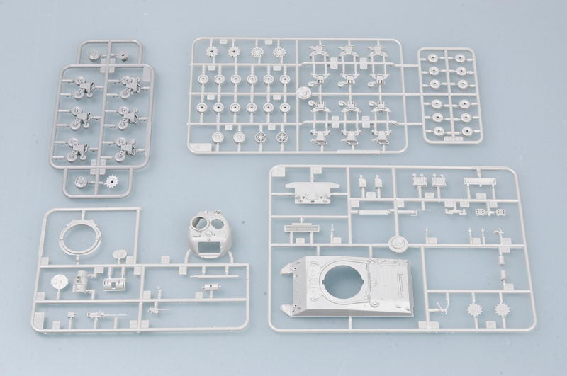 . The M4A3 mostly seen on the battlefield had the hull of a revised 47 degrees glacis armor arrangement and two larger hatches as compared to the old hull.Changes also took place in the prduction run to use a "high bustle turret". T he armor on the right-hand side of the turret was thickened in the casting process to compensate the thinned down inner armor needed to mount the gun equipment. So the turret no longer spotted an added on appliqué armor anymore. The kit faithfully depicted this kind of turret and a choice to build the early hull without the front ventilator blower cover.