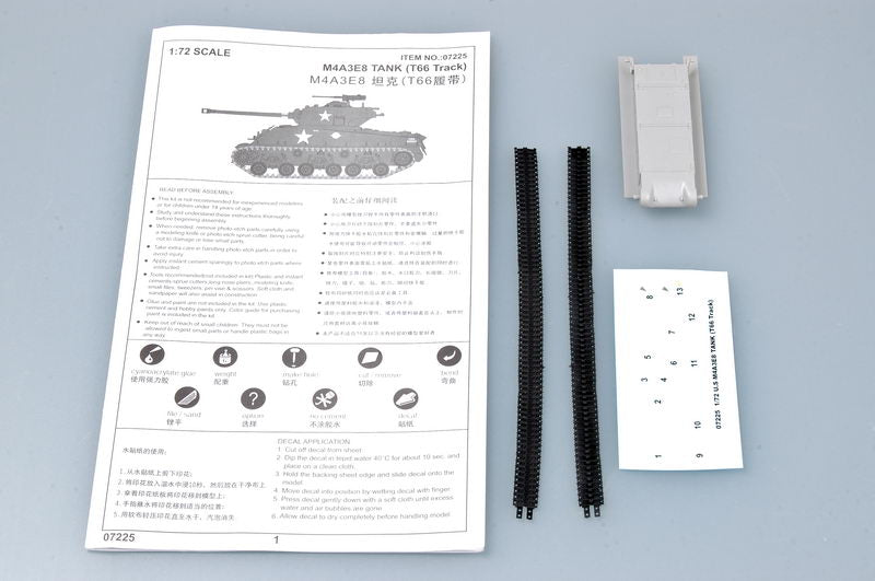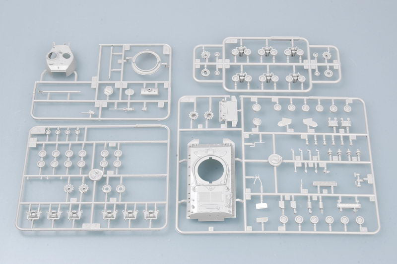 During the Korean conflict, the M4A3 medium tanks took part were mainly the E8 version with HVSS (horixontal volute spring suspension) system. Some were colorfully marked and had tiger faces in various forms painted on the vehicle's front.These late M4A3E8 had some differences when compare to the WW2 version. A field telephone was added to the right side of the rear plate and a first aid kit box on the hull's left. At this stage most of the M4s had added a weather tarp on the gun mantlet. Since the hinges of the heavy grilled engine access doors were too easy to get damage, a new and heavy duty hinges were introduced to M4A3s and this also appesred on some Korean conflict version M4A3E8. The kit contains all these features of the Korean conflict M4A3E8. Both kinds of E8 version engine decks are supplied.