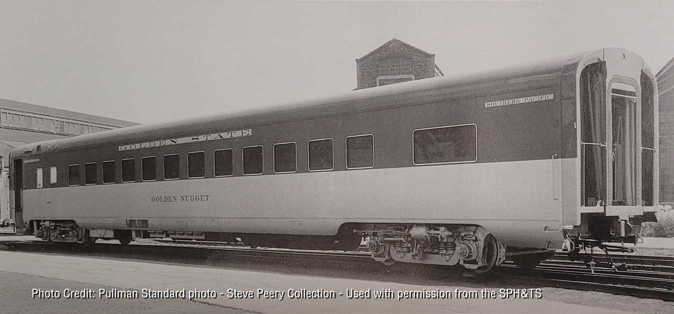 WalthersProto 920-18912 85' Pullman-Standard Southern Pacific 83-C-2 Coach -- Southern Pacific(TM) #2399 Golden Nugget (Simulated Stainless, large red strip, HO