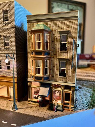This is a nice built-up with some good detail. The interior is easy to see and interesting. What'a nice about this is not just that it is built, but that it has some figures, a bench and other extras that normally would not be in a kit and you'd have to purchase/make/add separately. A nice addition to my street.