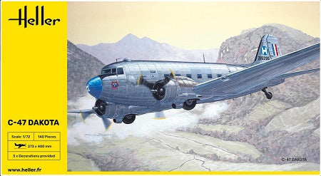 The Douglas DC-3 and its military variant Douglas C-47 and Douglas Dakota was a type of aircraft that was built from 1935 onwards in approximately 10,655 originals and 5,424 under license. A total of 16,079 pieces were manufactured, of which 607 were civil and 15,472 were military machines. This is the second highest number built for a passenger or transport aircraft to date. The military versions Douglas C-47 (US Air Force) and Douglas Dakota (Royal Air Force) became known in Germany with the nickname „Rosinen Bomber“ during the Berlin Airlift. The DC-3 was a development of the DC-1, of which only one prototype was built, with the maiden flight on July 1, 1933. During World War II, the DC-3 was used as a transport, tow plane, ambulance and passenger plane. In the American armed forces it had many designations and names, including C-41, C-47, C-48, C-49, C-50, C-51, C-52, C-53, C-68, C- 84, C-117, Skytrain, Skytrooper and in the US Navy it was called R4D. In the Royal Air Force, the aircraft was used under the name „Dakota“.